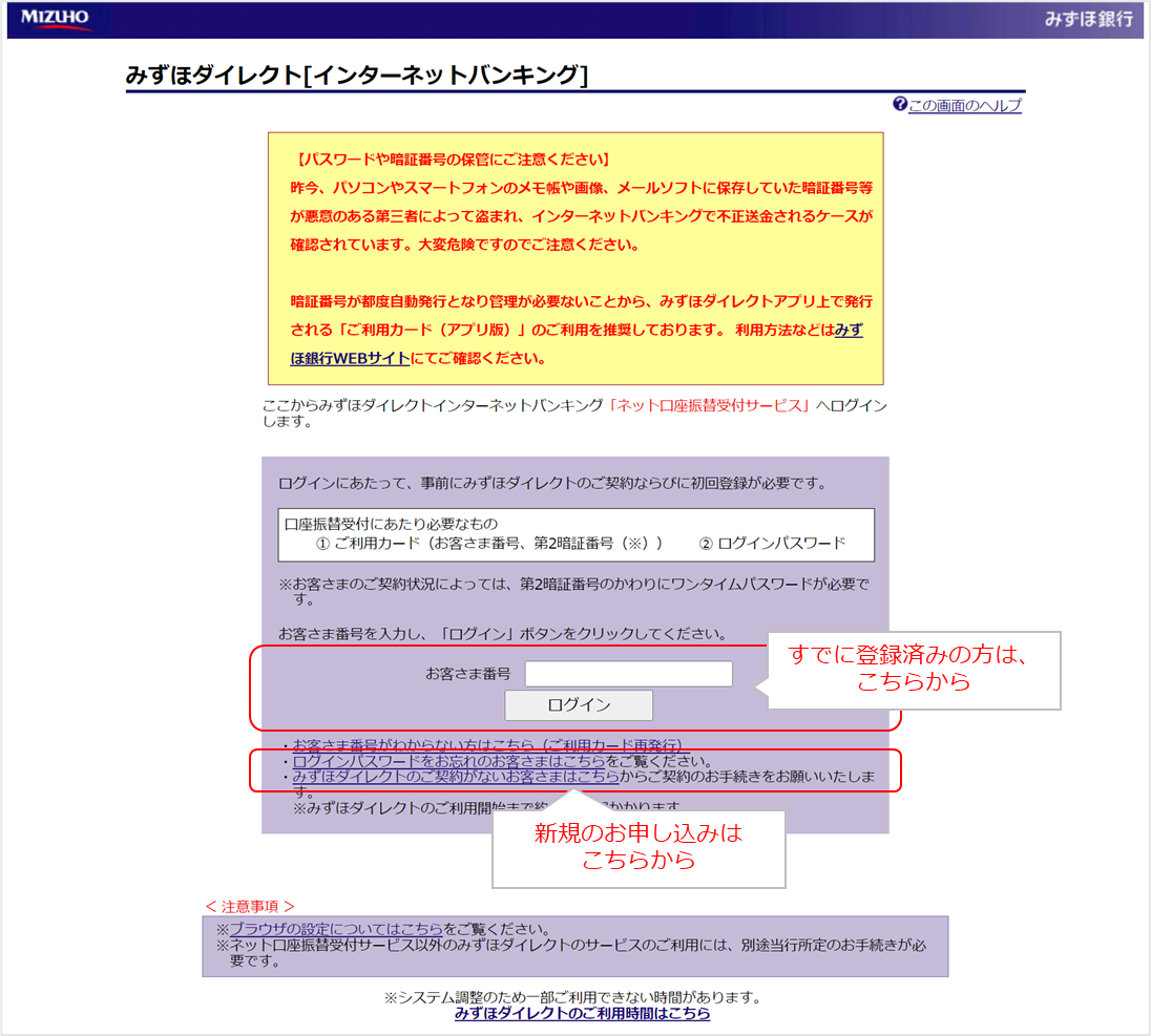 みずほ銀行をご利用の場合は「みずほダイレクト」のご契約ならびに初回登録が必要です。ご利用でない場合は「みずほダイレクトのご契約がないお客様はこちら」より登録してください。