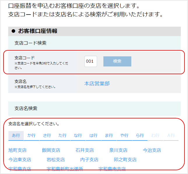 ④支店コードを入れて検索するか、画面下部の支店一覧から該当の支店を選択します。(検索した場合は、表示された支店名をクリックしてください)