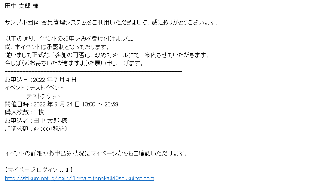 イベント申込申請が完了すると、申込受付メールが送信されます。